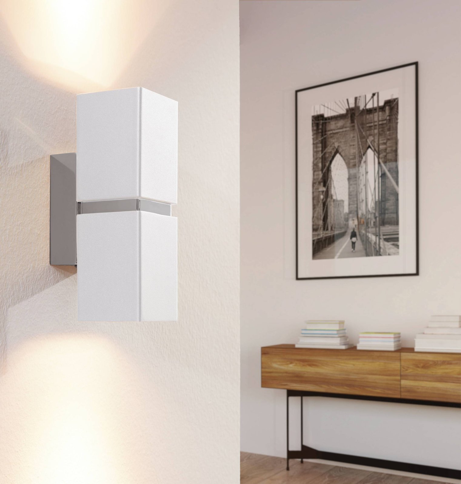 Moderní nástěnná svítidla vhodná k osvícení chodeb, předsíní, ale i obývacích pokojů apod. Jsou vyrobena z oceli. Svítí nahodu i dolů, což vypadá po rozsvícení velmi efektně. Svítidla se dodávají včetně žárovek se závitem GU10, které svítí teplou bílou barvou, je ale možné dokoupit chytré LED žárovky a pomocí aplikace v chytrém telefonu žárovky stmívat a měnit teplotu a barvu svícení. |
