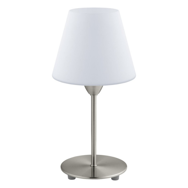 Jednoduchá lampička vyrobená z oceli v barvě matný nikl a z bílého opálového skla. |
