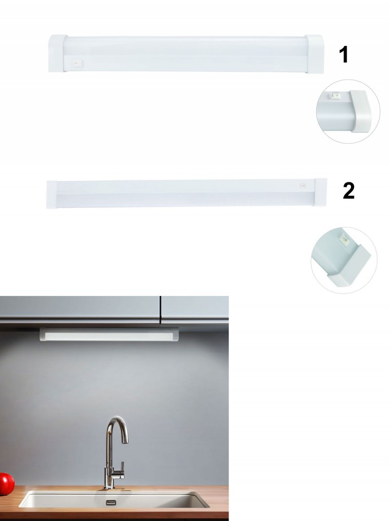 Plastové svítidlo pod kuchyňskou skříňku v bílé barvě pro osvětlení pracovní plochy. Praktický vypínač přímo na svítidle, který nemusíte používat, necháte jej trvale sepnutý v případě, že máte vypínač na stěně. Díky silné svítivosti se budete v zrcadle perfektně vidět jak při holení, tak malování či při osvětlení kuchnské linky |
