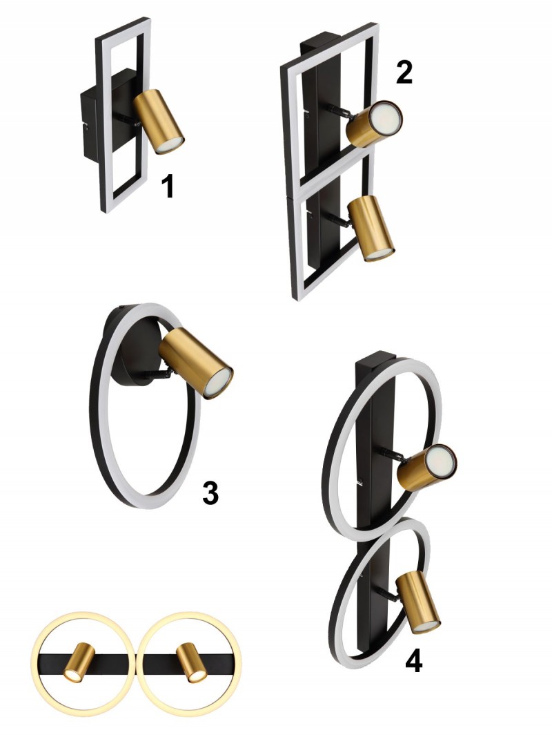 Moderní nástěnná svítidla vyrobená z kovu v matné černé a matné mosazné barvě a z plastu v barvě opálu. Rám svítidla je LED zroj, svítí teplou bílou barvou a je nevyměnitelný, reflektory, které jsou na svítidle, jsou na žárovky se závitem GU10 a dají se vyměnit. Doporučuje se osadit LED žárovkami. |