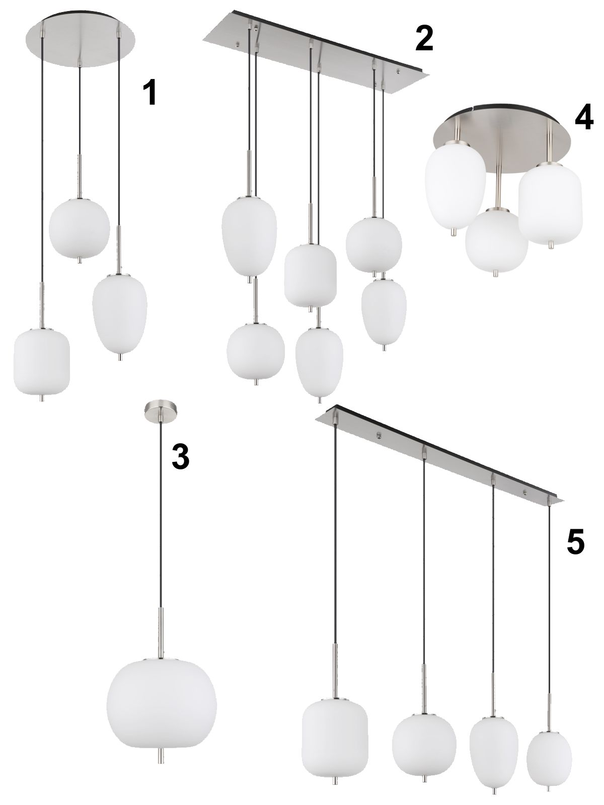 5. GL-15345-4NO Závěsné svítidlo kov nikl matný, sklo bílé, kabel PVC černý, možnost nastavení výšky, 4 různá skla, Dx?xV:1100x185x1200mm, Ø:stínítka: 15,8cm, 16,4cm, 16,5cm, 18,5cm, bez žárovek 4x E14 40W 230V detail výrobku
