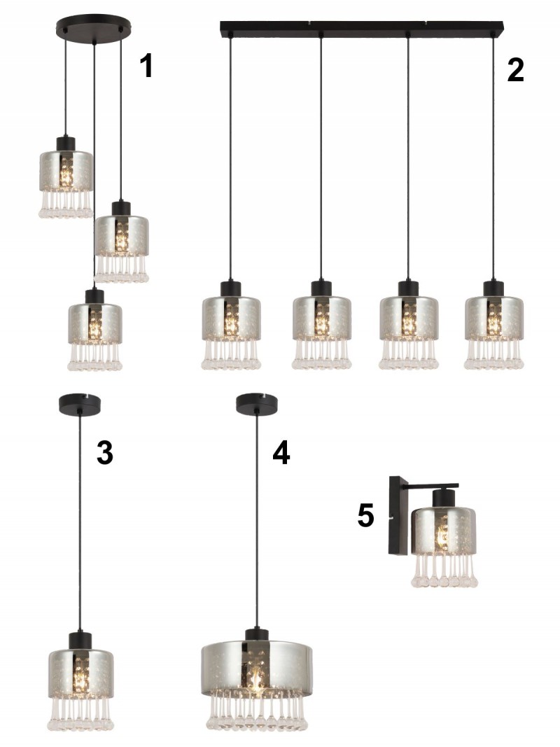 4. GL-15884H1 Závěsné svítidlo, kov černý matný, sklo kouřové, skleněné kapky průhledné, akrylové křišťály průhledné, kabel PVC černý, Ø:250mm, V:1200mm, bez žárovky 1xE27, max. 60W 230V detail výrobku