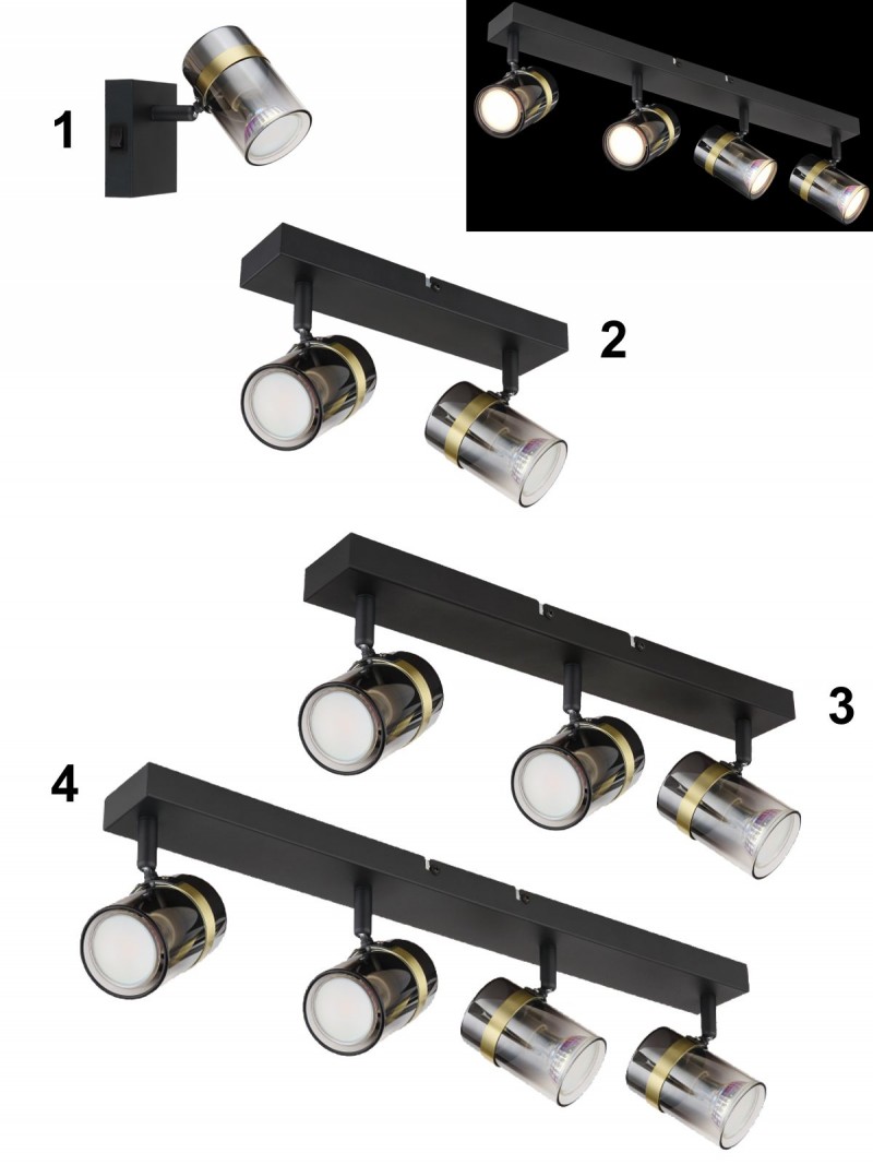 4. GL-57916-4 Stropní svítidlo, bodové, kov černý matný, kouřové sklo s přechodem do průhledného skla, mosaz, Dx?xV:560x60x125mm, bez žárovek 4xGU10,max. 8W 230V detail výrobku
