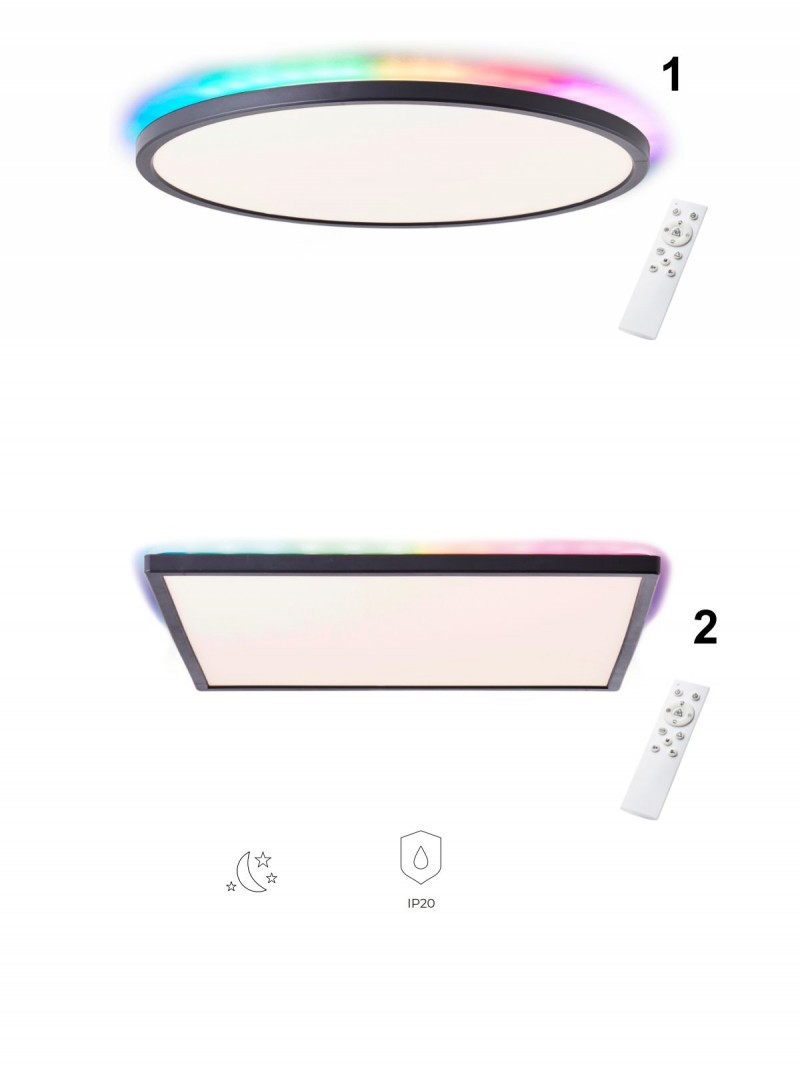 Jednoduché stropní svítidlo vyrobené z plastu v černé barvě. Je vhodné do obývacích pokojů, ložnic, pracoven, chodeb i předsíní. Dodává se včetně dálkového ovladače, kterým lze svítidlo pohodlně ovládat. Má také funkci nočního světla a změnu RGB barev. |