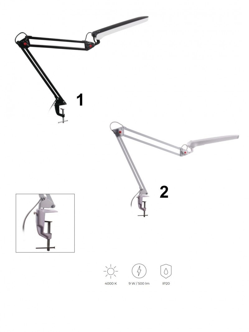 Moderní LED lampičky s klipem, díky kterému se snadno připevní na desku stolu v pracovně, kanceláři nebo studentském pokoji. Jsou vyrobeny z kovu a plastu. Svítí neutrální bílou barvou. Zdroj je integrovaný a není možné ho měnit. |