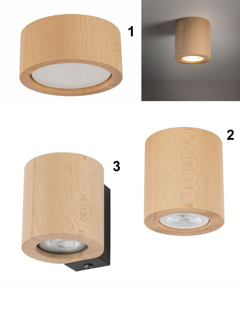 Jednoduchá svítidla válcového typu. Vyrobená jsou ze dřeva a kovu, v barvě buku. |