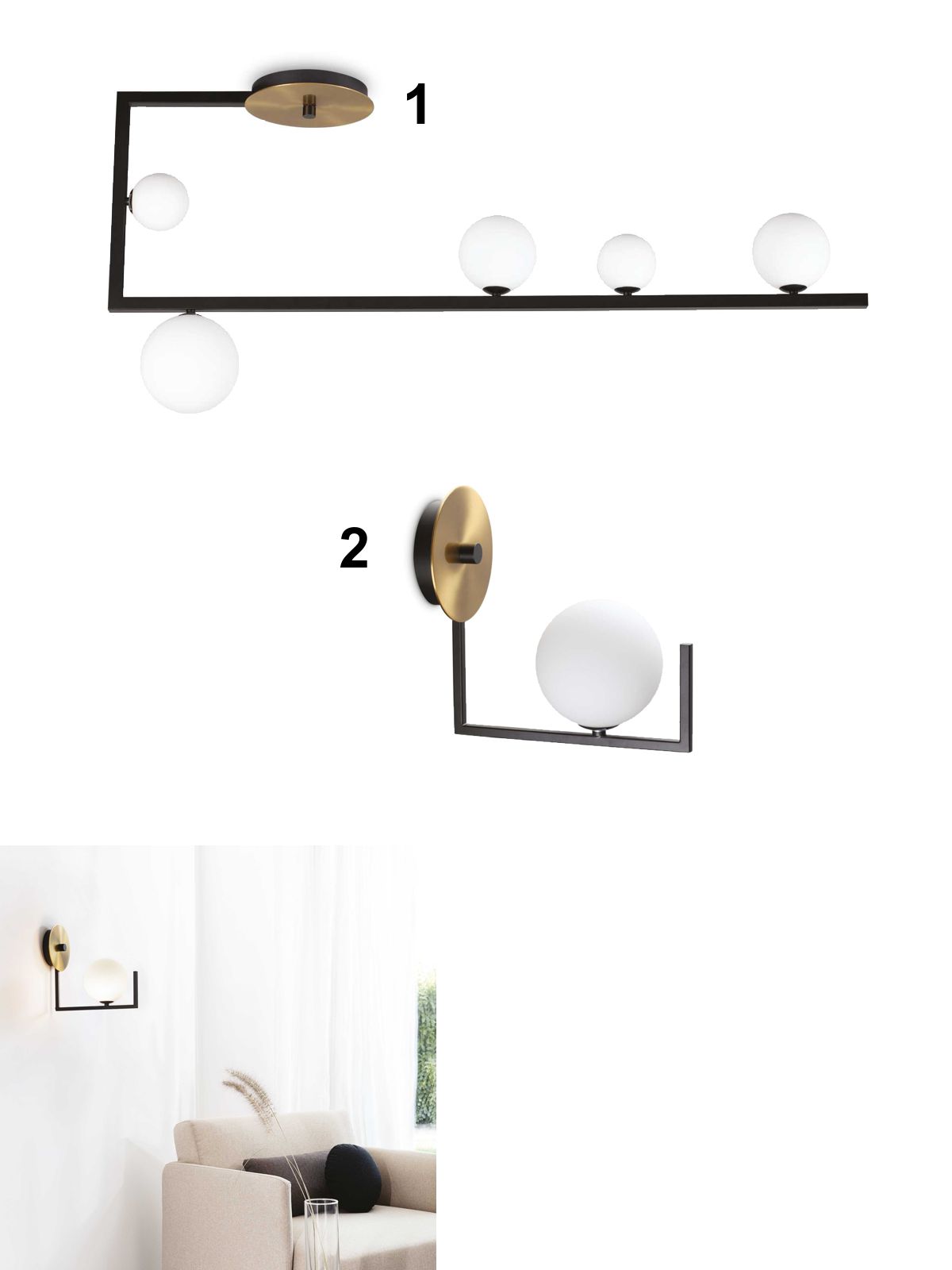 Elegantní svítidla vyrobená z kovu a skla. Základna svítidla je v matné černé barvě, doplněná o matnou mosaznou, skleněné koule stínidel jsou v bílé barvě. Jsou vhodná do obývacích pokojů, ložnic, předsíní apod. Dodávají se včetně žárovek se závitem G9. |