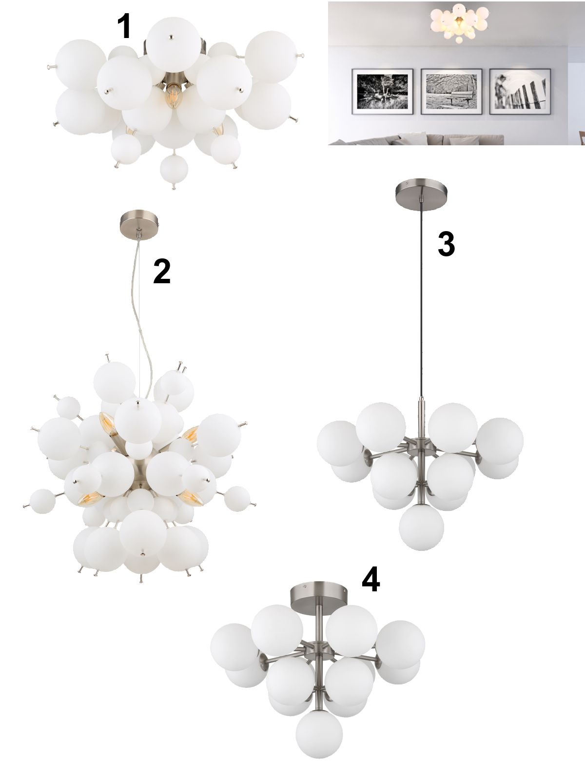 1. GL-15633DO Stropní svítidlo, kov nikl matný, skleněné koule bílé, kabel PVC černý, ø:550mm, V:280mm, skleněné koule ø:15x6cm, 1x 10cm, bez žárovek 3xE14, Max. 25W 230V detail výrobku