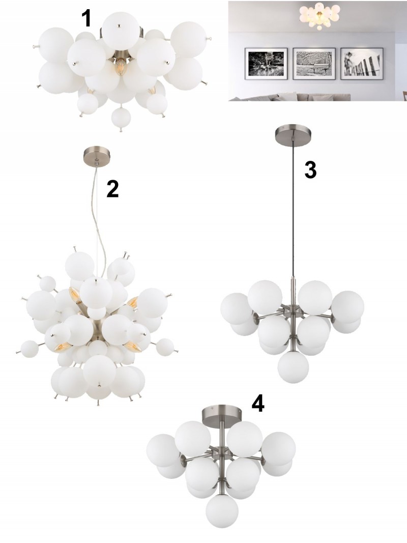 2. GL-15633HO Závěsné svítidlo, kov nikl matný, skleněné koule bílé, kabel PVC černý, ø:550mm, V:1200mm, skleněné koule ø:24x6cm, 24x10cm, bez žárovek 6xE14, Max. 25W 230V detail výrobku