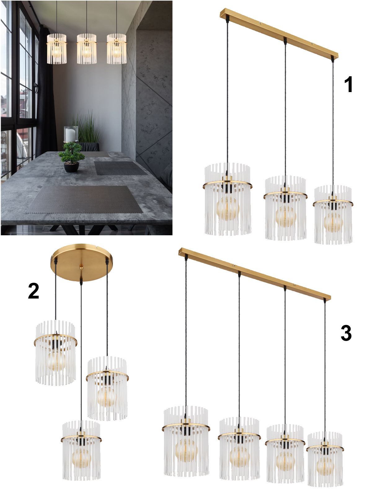 1. GL-15698-3HM Závěsné svítidlo, kov zlaté barvy, skleněné tyče bílé, průhledné, kabel PVC černý, možnost zkrácení výšky, Dx?xV:800x200x1400mm, bez žárovek 3xE27, Max. 60W 230V detail výrobku