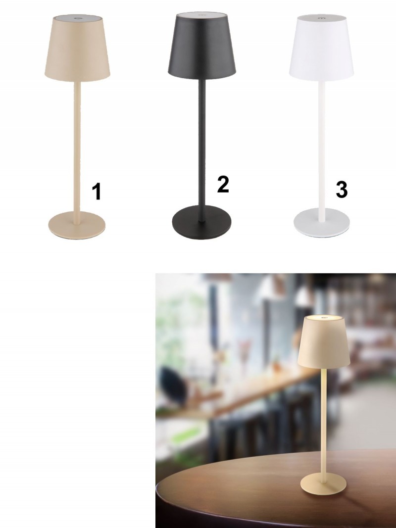 1. GL-58438S Stolní svítidlo, kov a plast barva písková, plast bílý, dotykové zapnutí/vypnutí, plynulé dotykové stmívání, paměť, aku CR18650 1800mAh 3,7V , IP44, ø:106mm, H:360mm, V:36cm nebo 24cm, včetně LED 3W 230V, výstup 300lm, 3000K detail výrobku