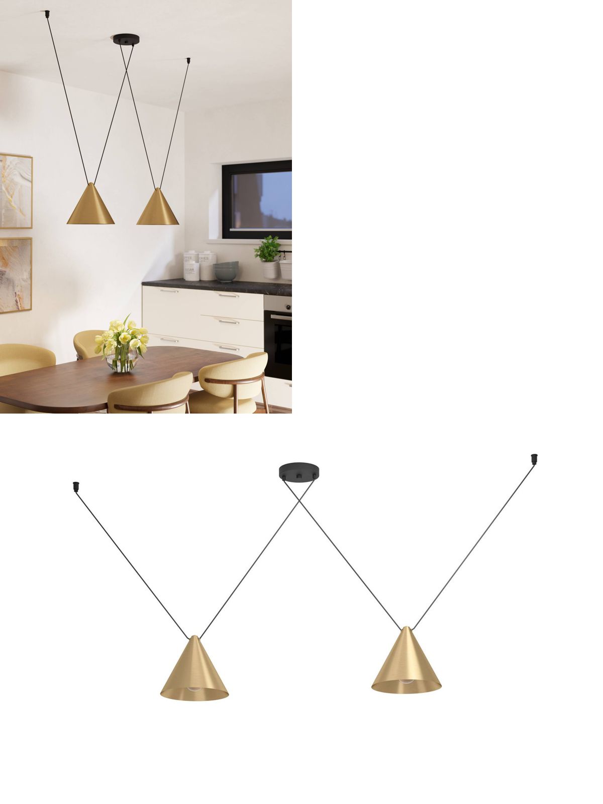 Moderní závěsné svítidlo z rodiny Narices. Zajímavý prvek do vašeho obývacího pokoje, jídelny nebo předsíně. Svítidlo je vyrobeno z oceli v barvě černé, zlaté a broušené oceli. |