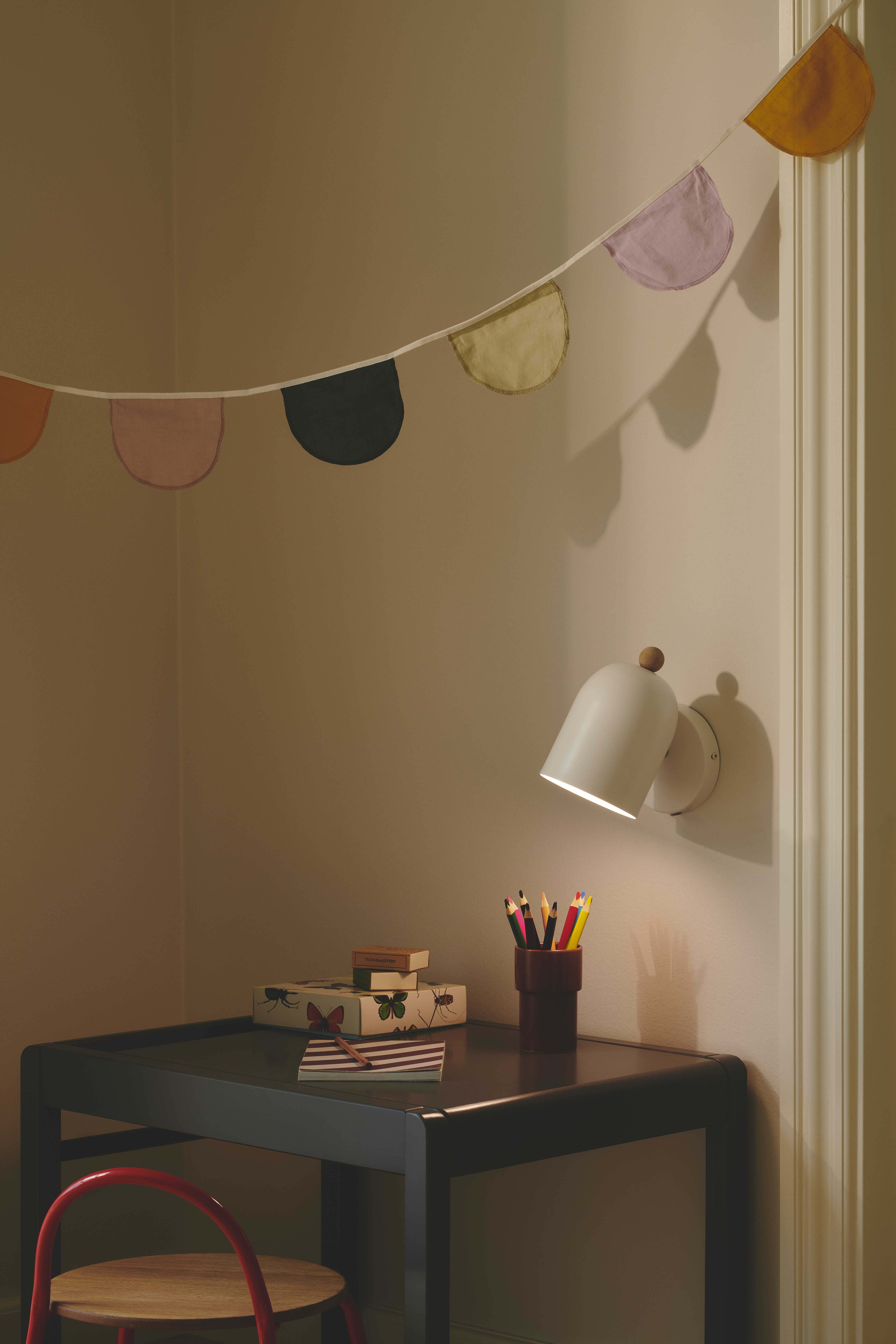 | Jednoduché nástěnné svítidlo Gaston ve 4 tlumených barvách se skvěle hodí do dětského pokoje. Zaoblené stínítko s dřevěným detailem otočíte díky nastavitelné hlavě. | |