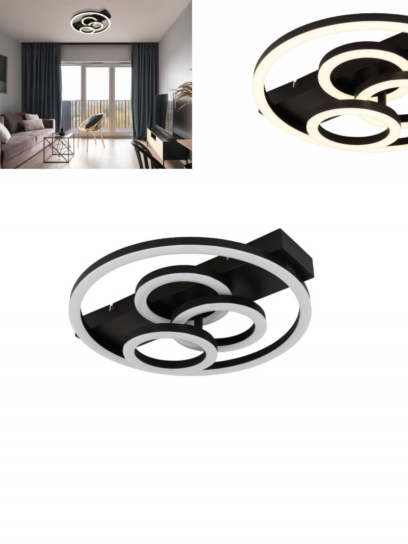 Stropní LED svítidlo vyrobené z kovu a plastu v kombinaci černé a bílé barvy. Svítidlo je stmívatelné vypínačem na zdi nebo dálkovým ovladačem, má také mnoho funkcí jako je paměť posledního nastavení, fixace barev, časovač či noční světlo. |