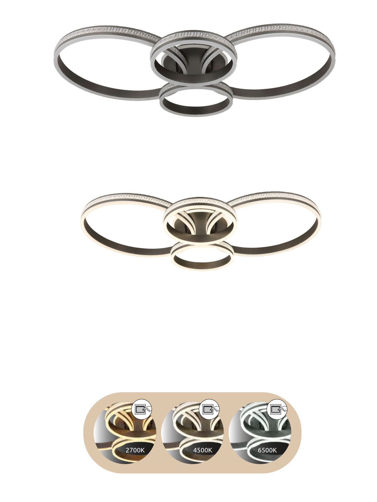 Moderní stropní svítidlo Grouni LED je vyrobeno z kovu v matné titanové barvě, s čirými plastovými křišťálky. Díky CCT je možné pomocí vypínače na zdi nastavit teplotu svícení na 2700K/450K nebo 6500K pro vytvoření příjemné atmosféry v interiéru. Má také funkci paměti posledního nastavení. |