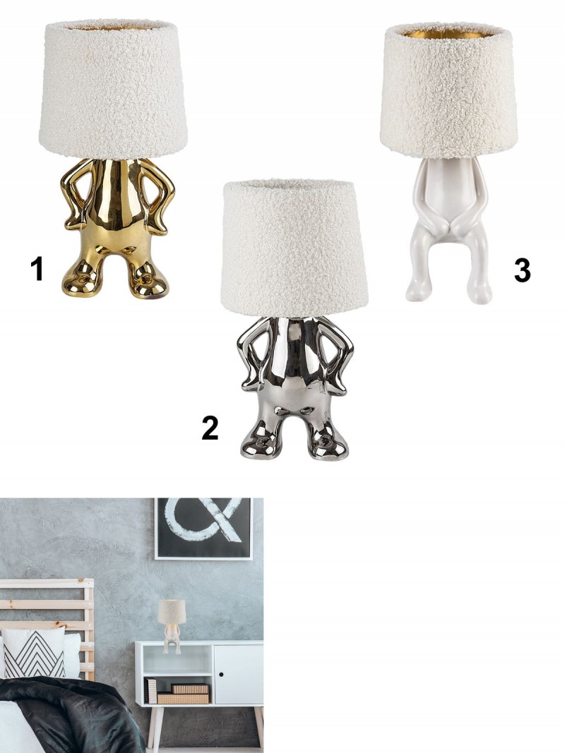 Stylové lampičky vyrobené z keramiky a textilu. Keramická základna je ve stylu postavičky, klobouk stínidla je v imitaci kůže z ovce. Skvěle se hodí do moderních interiérů i dětských či studentských pokojů. |