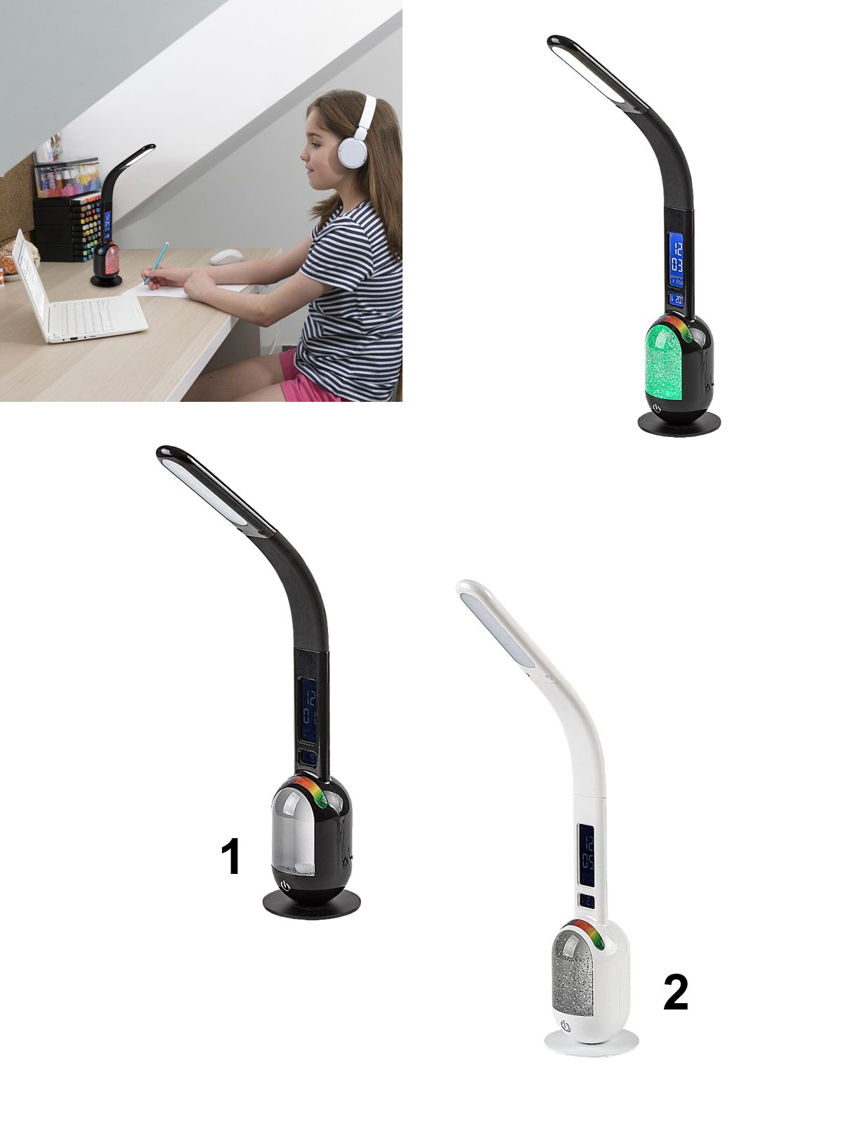 Tato moderní lampa je celá vyrobena z plastu, doplněna dekorativní základnou ve tvaru disku. Rameno lampy je tenké a ploché, se dvěma displeji ve spodní části. Kulatá část konstrukce, která se dotýká dekorativní základny, je naplněna tekutým slídovým materiálem – tato část je samostatně spínatelná. Lampa umožňuje RGB osvětlení, díky čemuž může slídová výplň svítit různými barvami. |