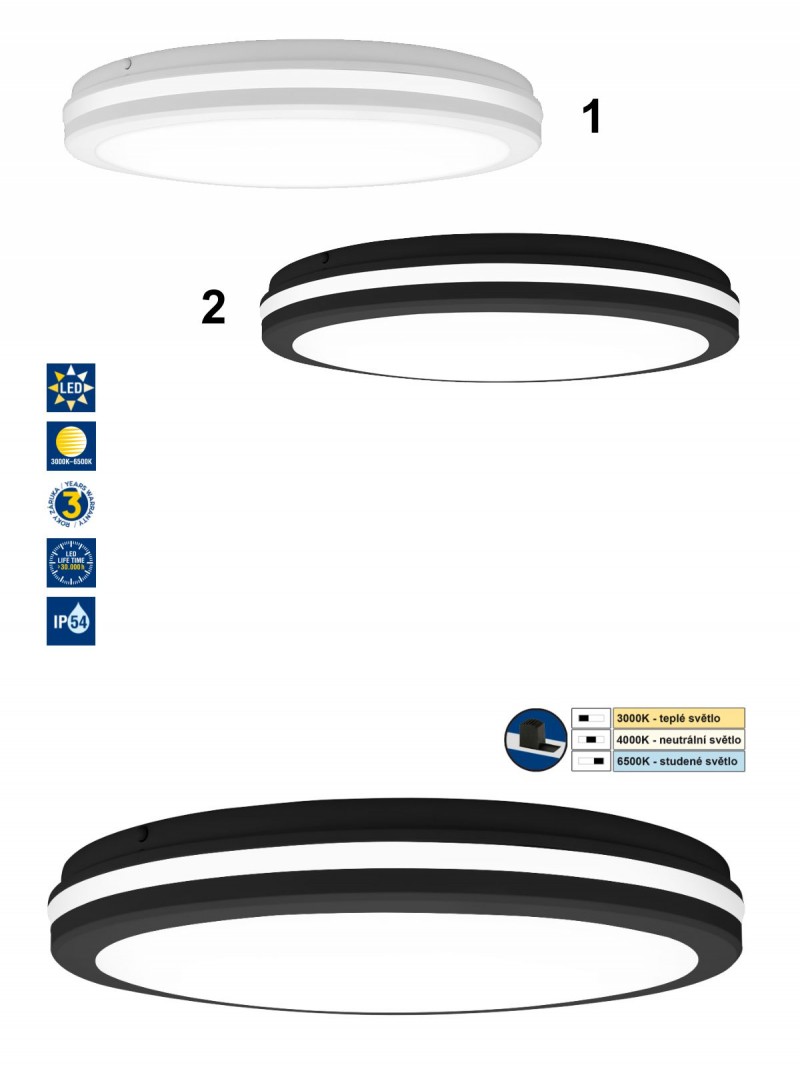 Kulaté stropní svítidlo vyrobené z plastu. Díky IP54 je vhodné také do vlhčích prostor jako je koupelna, WC, ale také balkon nebo terasa. Svítidlo má přepínač, kterým lze nastavit teplotu svícení na 3000K/4000K nebo 6500K. |
