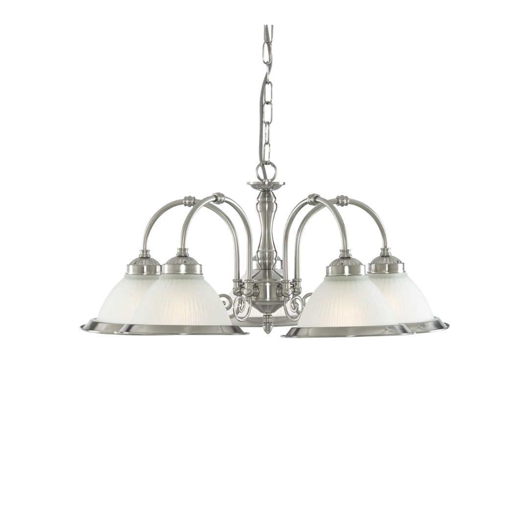 Stínidlo visí na řetězu. Kov je provedení matné stříbro a sklo je matované. Má pět ramen s paticemi pro zdroj E27. Žárovky je potřeba dokoupit. Vyberte max. příkon 60W. Od stropu je celková délka i se sklem 1,2 m, stínidlo má průměr 62 cm. Honosný lustr s pěti světly je vyhotoven ve starožitném stylu. Kovové prvky mají matně stříbrný odstín a skleněná miskovitá stínidla žebrovanou strukturu. Svítilo je velmi dekorativní a dostatečně prozáří i větší prostory interiéru. |