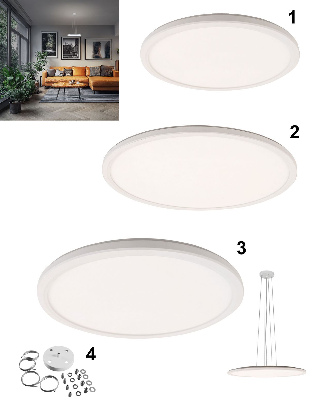 Moderní kulaté svítidlo vyrobené z plastu v bílé barvě. Díky přepínači lze nastavit teplotu svícení na 3000K/4000K nebo 6000K. Má ochranu IP54, takže je vhodné také pro venkovní použití. Svítidlo pod číslem 2 a 3 lze dokoupením závěsu vytvořit elegantní závěsné svítidlo. |