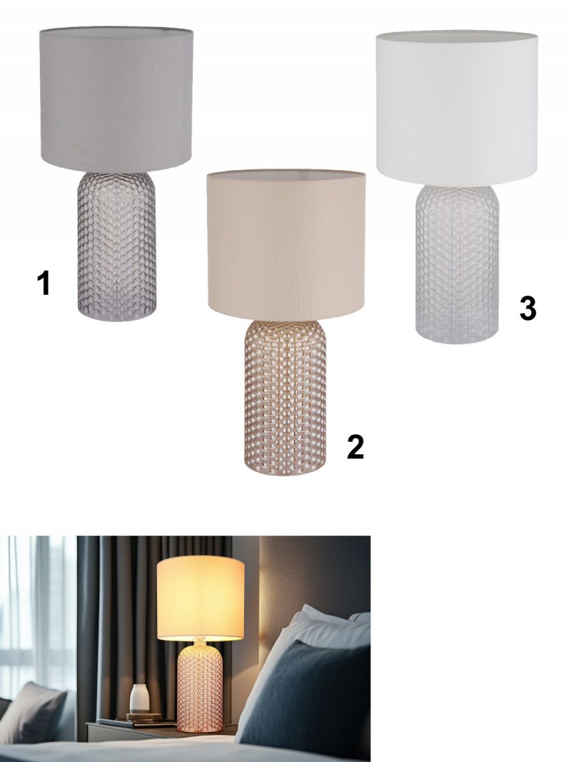 Stylová stolní lampička vyrobená ze skla a textilního stínidla. Skleněná noha svítidla je dekorovaná, což ji dodává zajímavý vzhled. Skvěle se hodí do obývacích pokojů, ložnic i předsíní k dotvoření příjemné atmosféry. Se závitem E27. Žárovky nejsou součástí balení. Délka kabelu 130 cm. |