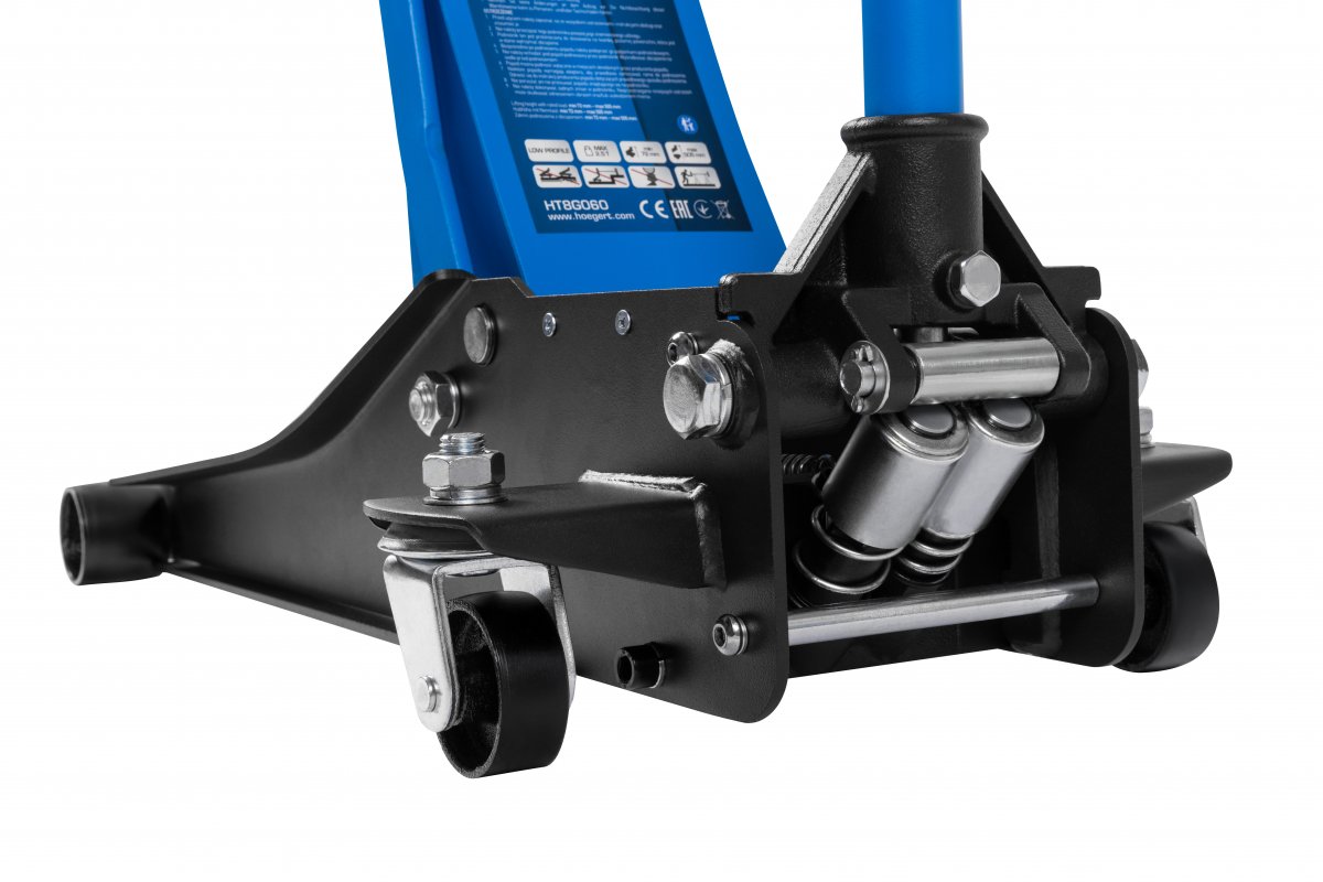 Hydraulický zvedák typu „žába“ s velkým rozsahem pracovní výšky. Umožňuje zvedat břemena do hmotnosti 2,5 T do výšky od 72 do 505 mm. Automobilový zvedák navržený pro vozy se sníženým podvozkem. Díky své robustní konstrukci a odolnému dvoupístovému hydraulickému válci zvedá vozidlo bez námahy a rychle, aniž by hrozilo jeho náhodné spadnutí. Odolné přední přepravní kolečka a zadní otočná kolečka zajišťují pohodlný přístup k vozidlu a stabilní umístění kdekoli. Vestavěný ventil proti přetížení chrání před překročením maximální nosnosti a prodlužuje životnost zařízení. Silnostěnná ocel a pevné svary zaručují dlouhou životnost i při intenzivním používání.