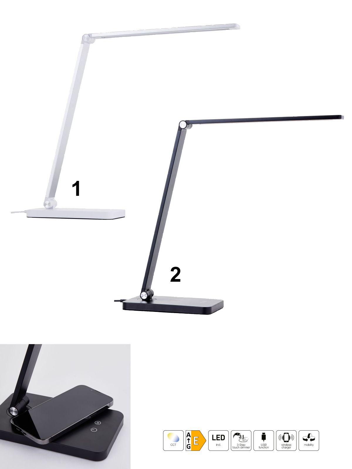 Moderní kancelářská lampička vyrobená z kovu a plastu, nabízí pohodlné bezdrátové nabíjení chytrého telefonu přímo na noze lampičky nebo nabíjení přes USB kabel. Lampa je vybavena dotykovým spínačem, který umožňuje nastavit jas ve třech úrovních, a dokonale tak přizpůsobit světlo vašim potřebám. Hlava lampičky je flexibilní a umožňuje Vám nastavit svícení přesně tam, kam potřebujete. |