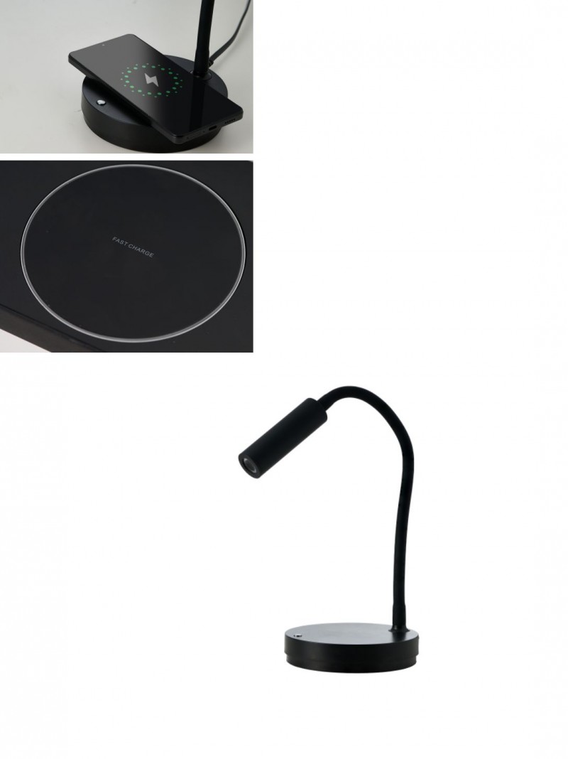 Moderní lampička vhodná do kanceláře nebo studentských pokojů. Je vyrobená z hliníku, plastu a gumy v elegantní černé barvě. Lampičku je možné stmívat stmívačem umístěným na základně svítidla. Má také funkci bezdrátového nabíjení chytrého telefonu. |