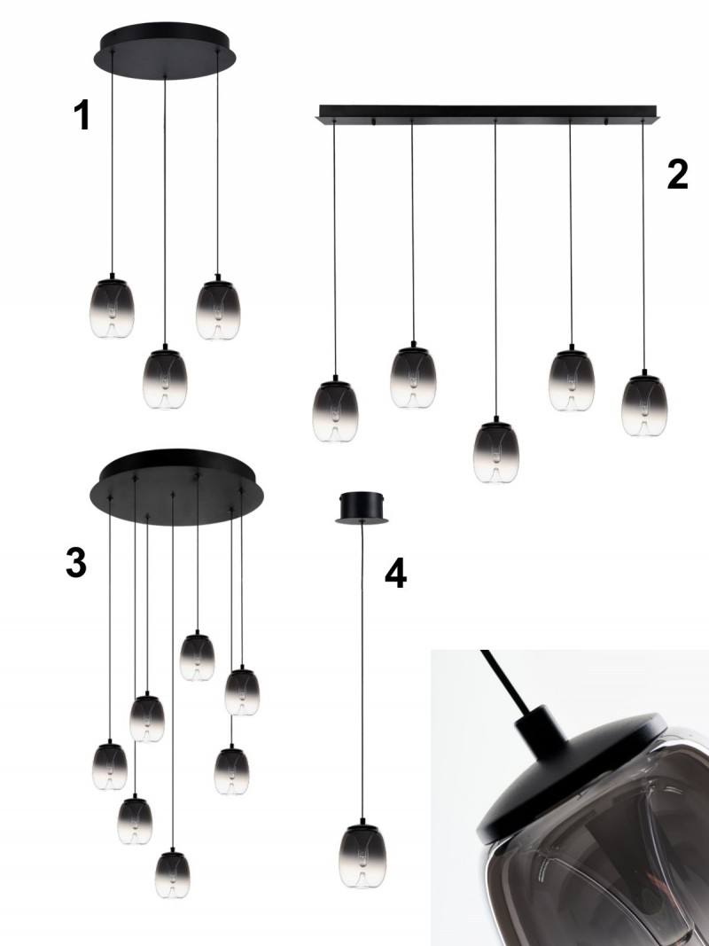 Závěsná svítidla Pamela smoky jsou vyrobená z hliníku a skla v černé a kouřové barvě. Působí moderně a elegantně. Svítí teplou bílou barvou. LED zdroj je zabudovaný ve svítidle a není možné ho měnit. |
