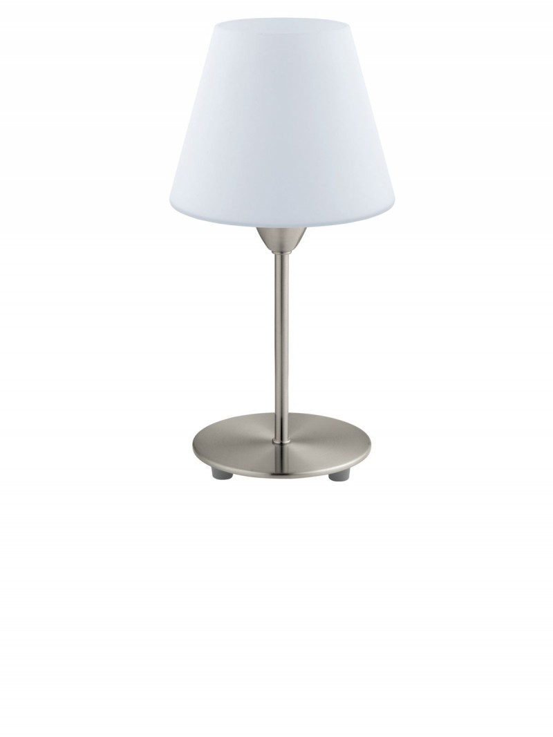 Jednoduchá lampička vyrobená z oceli v barvě matný nikl a z bílého opálového skla. |