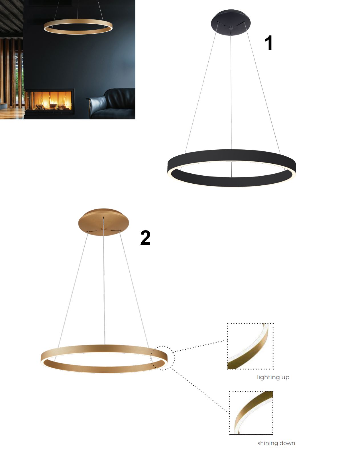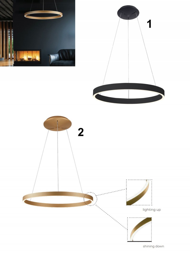 Designová závěsná svítidla vyrobená z hliníku a silikonu. Svítí teplou bílou barvou a je možné je stmívat. Prstenec svítí nahoru i dolů. Svítidlo má dobrou svítivost ale díky zabudovanému LED zdroji je energeticky nenáročné. Hodí se do všech moderních interiérů. |