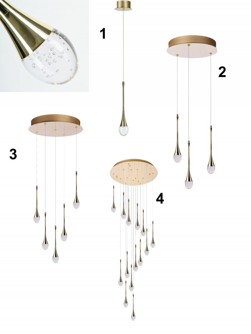 Moderní závěsná svítidla vyrobená z hliníku a akrylu. Zlatá barva se skvěle hodí do všech interiérů a působí luxustním a elegantním dojmem. LED zdroj je zabudovaný a není možné ho měnit. Svítí teplou bílou barvou. |