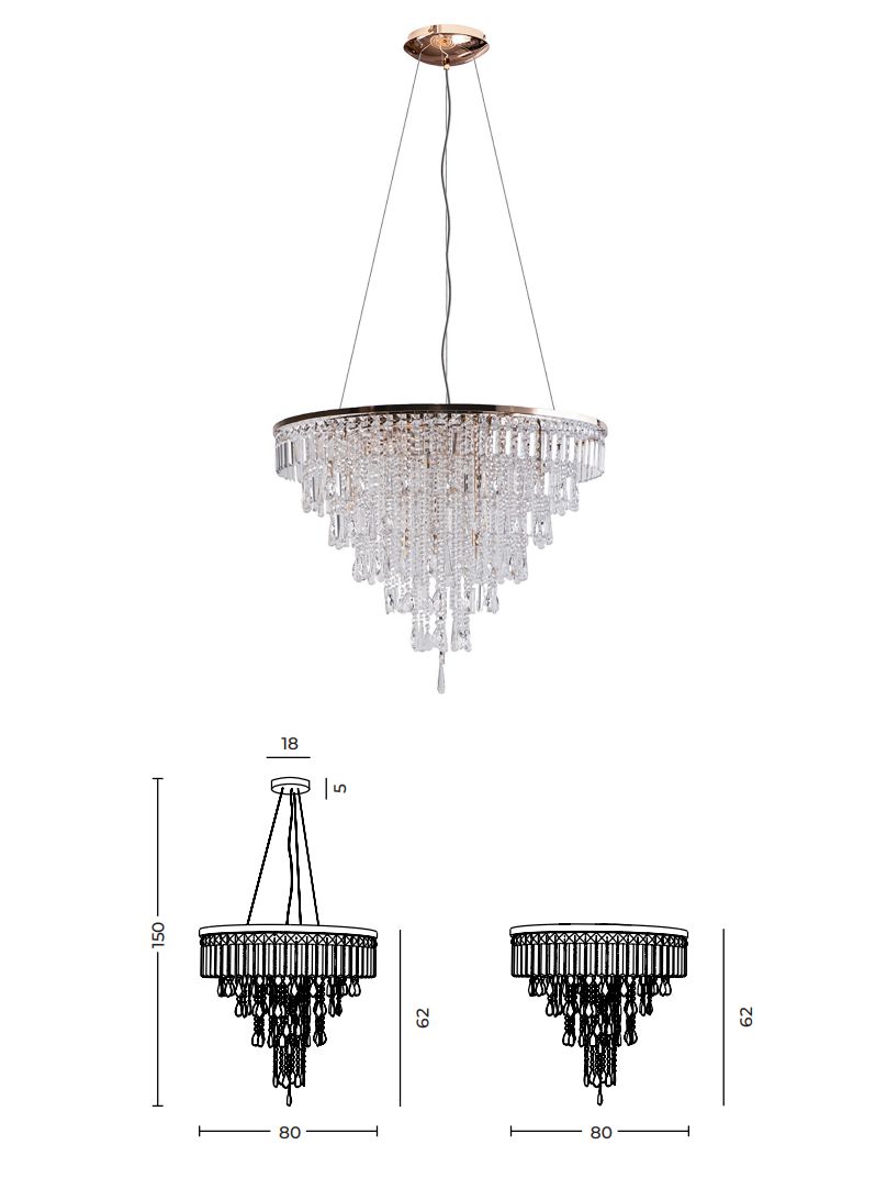 Svítidlo Kalabria rose gold je vyrobeno z kovu v barvě růžové zlato a z čirých křišťálů K9. Svítidlo je možné použít jako závěsné nebo stropní. Dodává se včetně lanek, na které je možné ho zavěsit nebo z něj uděláte stropnici. |