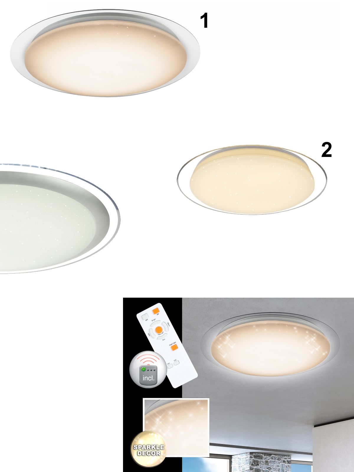 Sparkle dekor= jiskry, třpitky. Lze regulovat teplou a studenou barvu světla ovladačem na zdi i dálkovým ovladačem, noční světlo. |