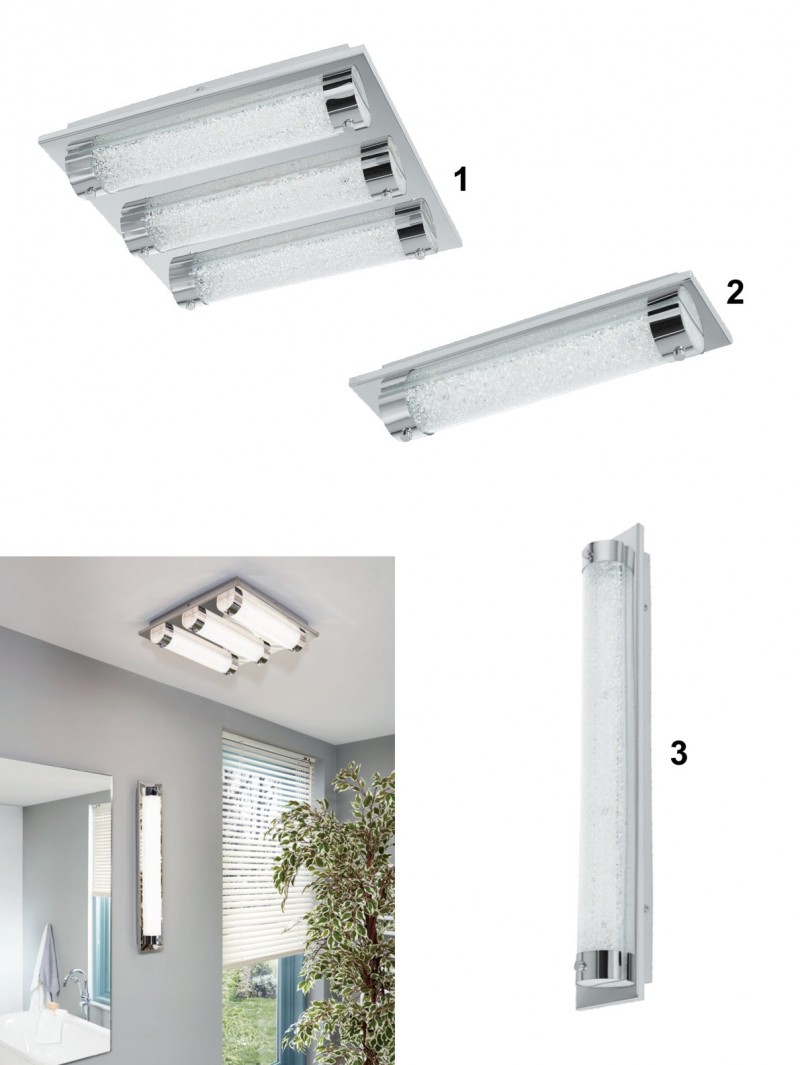 Designová svítidla vhodná díky IP44 ochraně také do koupelny. Je možné je osadit jak na stěnu, tak na strop. Jsou vyrobeny z oceli v chromové barvě a z plastu v čiré barvě s křišťálky. Po rozsvícení se křišťálky třpití a světlo působí luxusním dojmem. Svítí neutrální bílou barvou a není možné ho stmívat. |