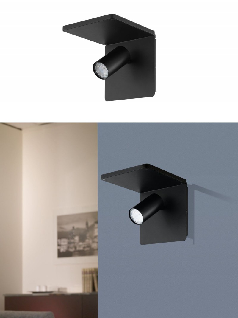 Lampička nebo také nástěnné svítidlo z hliníku a oceli v černé barvě. Svítidlo s odkládací plochou slouží zároveň jako nabíječka mobilních telefonů s QI technologií. Skvěle se hodí např. do ložnice ke čtění v posteli a zároveň slouží jako odkládací plocha pro mobilní telefon. |