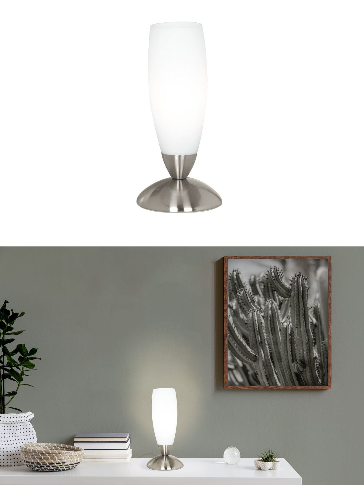 Lampička vhodná do interiérů v klasickém stylu. Postavte ji na konferenční stolek nebo komodu v obývacím pokoji, nebo na noční stolek do ložnice. Je vyrobena z oceli v barvě matný nikl a stínidlo je skleněné v bílé barvě. |