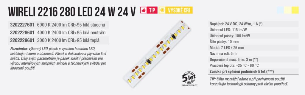 Díky napájení 24V a 7LED v sérii má pásek i vysokou účinnost.