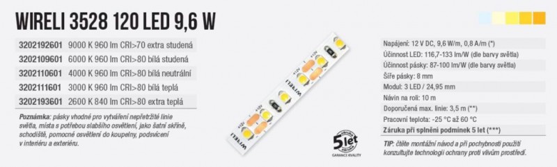 LED pásek 3528 120 WIRELI SS 840lm 9,6W 0,8A (extra teplá) - LED pásky