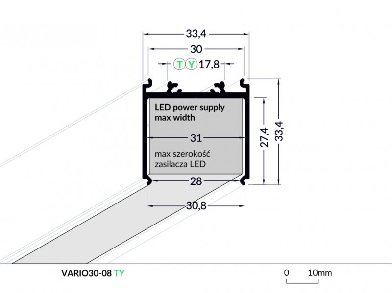 Montážní profil pro profily VARIO30-01, 02, 03 pro úmístění napájecího zdroje pro svítidlo.