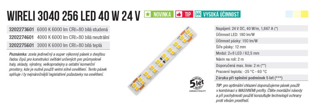 LED pásek 3040 256 WIRELI WW 6000lm 40W 1,667A 24V (bílá teplá) - LED pásky