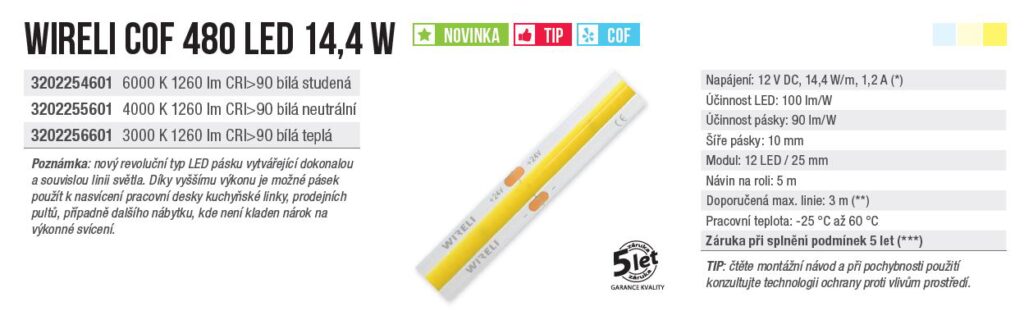 LED pásek COF 480 WIRELI WN 1260lm 14,4W 1,2A 12V (bílá neutrální) - LED pásky