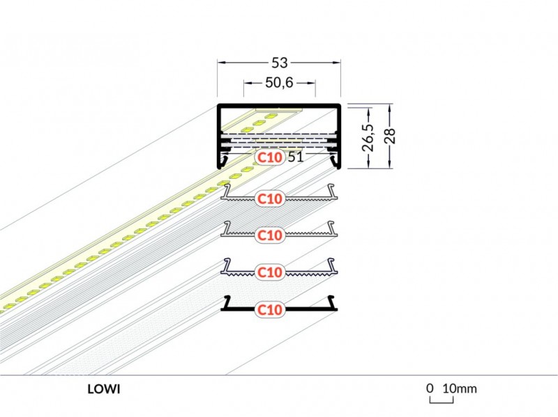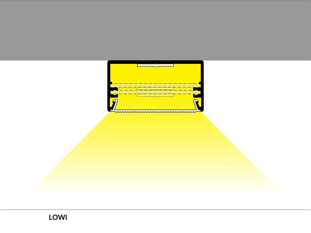 Nakládaný profil určený pro stavbu výkonných svítidel v interiérech. Vhodný do kanceláří, studoven, hal a dalších místností s potřebou velmi silného osvětlení.