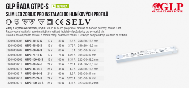 Napěťový zdroj s extrémně malým průřezem pro LED výkonové osvětlovací profily.