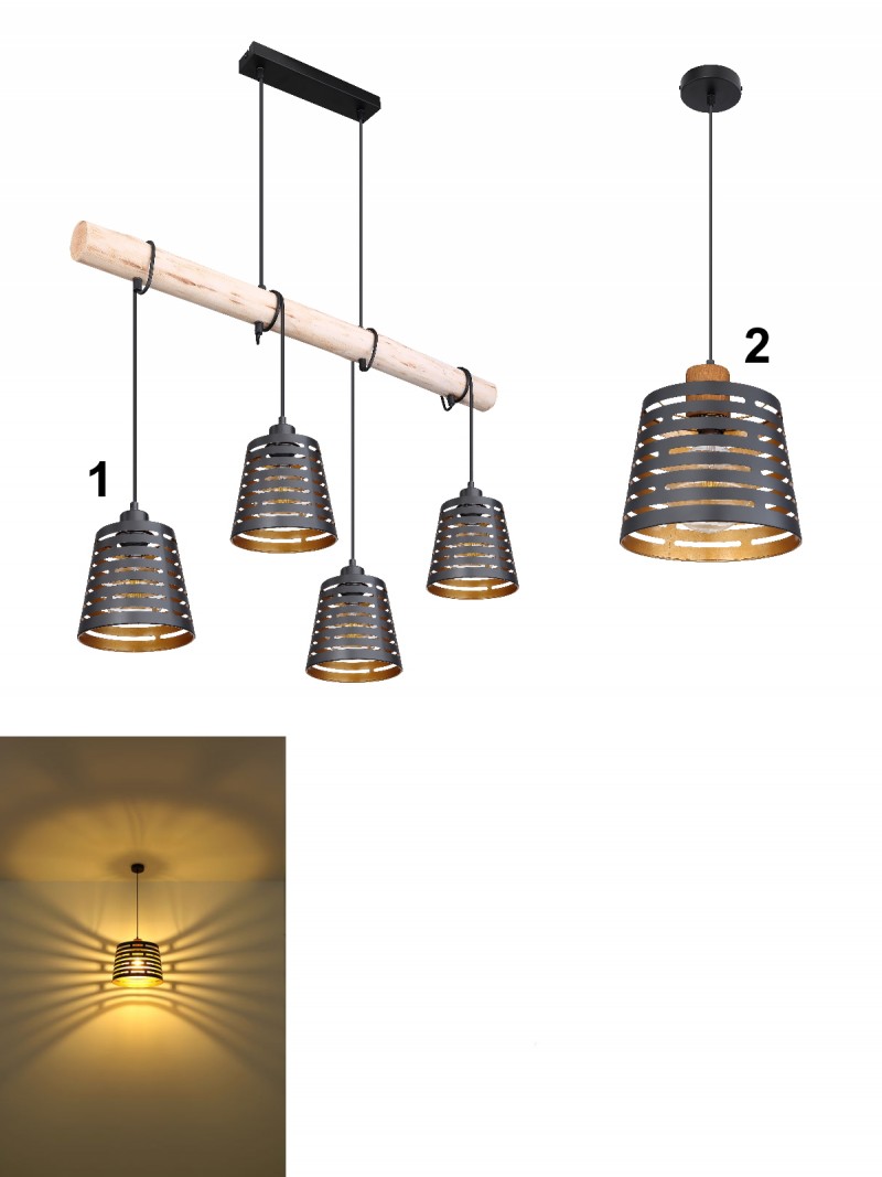2. GL-15451H Závěsné svítidlo, kov černý matný, dřevo, kov černý a zlatý, Ø25cm, V:120cm, bez žárovky 1xE27, max. 60W 230V detail výrobku