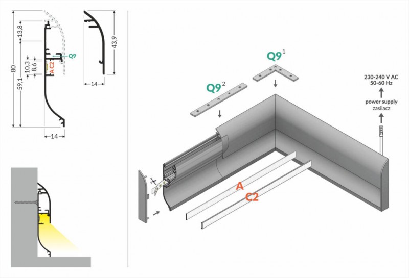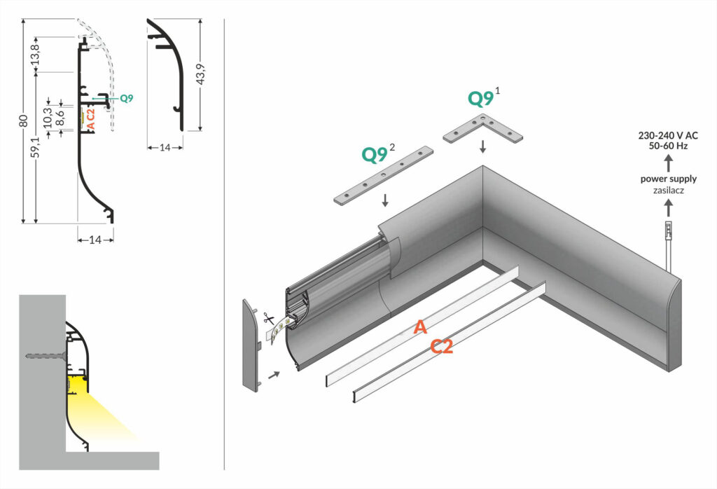 Profil WIRELI SKIRT10 AC2/Q9 hliník surový, 2m (metráž) - Hliníkové LED profily