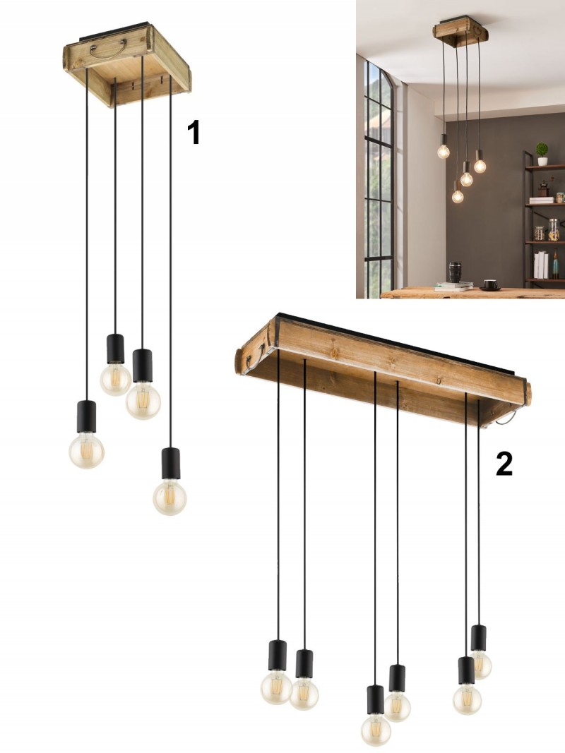 Stylová závěsná svítidla vyrobená ze dřeva v hnědé barvě a z oceli v černé barvě. Na stropě je umístěná dřevěná krabice, z níž vysí objímky v černé barvě. Osaďte je zajímavými retrožárovkami, čímž ještě umocníte jedinečnost tohoto svítidla. |