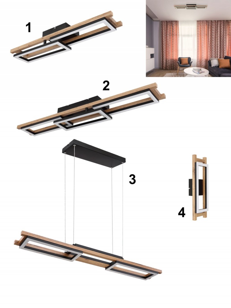 2. GL-67266D1 Stropní svítidlo, kov černý, MDF vzhled dřeva, plast bílý, stmívatelné, vícekrokové ovládání přes nástěnný vypínač, fixace barvy,paměť, noční světlo, dál.ovládání, Dx?xV: 100x35x11cm, LED 30W 230V, 350-4000lm zdroj, 150-1800lm výstup, 2700-6500K detail výrobku